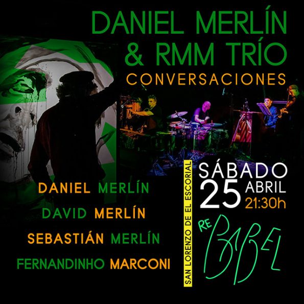 El artista Daniel Merlín crea obras pictóricas de gran formato en tiempo real inspirándose en la música que interpreta el grupo RMM Trío. En el lienzo, la obra de arte se va desarrollando, creciendo y tomando forma en continuo diálogo con el sonido, la música, de creación propia, que recorre estilos clásicos que van del barroco a la música contemporánea, fusionando con el folklore americano, ritmos de raíz africana y sonidos de síntesis electrónica inesperados.
