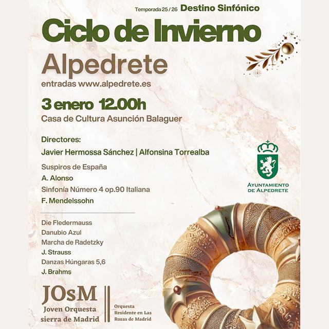 Bajo la dirección de Javier Hermossa Sánchez y Alfonsina Torrealba, el programa viajará de la zarzuela al gran repertorio centroeuropeo. Sonará el pasodoble “Suspiros de España” de A. Alonso y la Sinfonía n.º 4 op. 90 “Italiana” de F. Mendelssohn. No faltarán los clásicos de Año Nuevo firmados por J. Strauss, con fragmentos de “Die Fledermaus”, “El Danubio Azul” y la popular “Marcha de Radetzky”, junto a las Danzas Húngaras n.º 5 y 6 de J. Brahms.