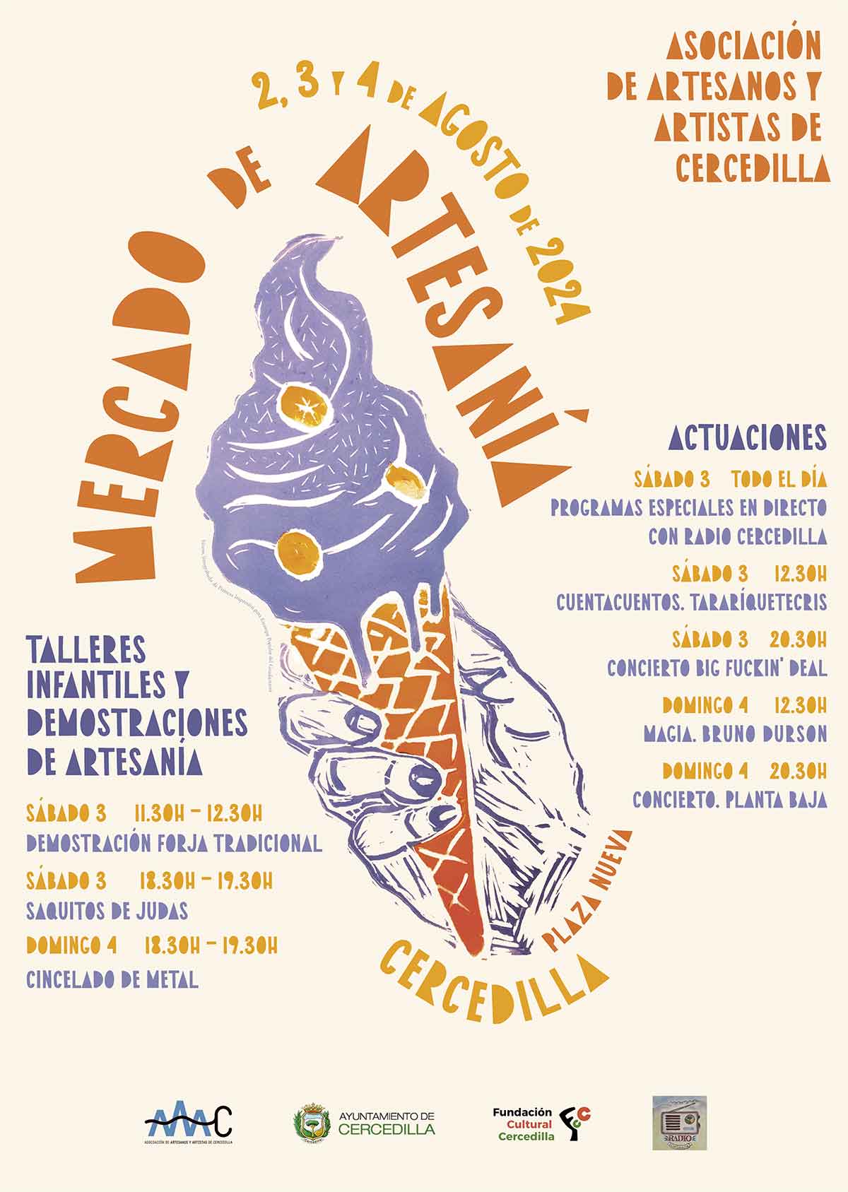 21 puestos de artesanía local de la Asociación de Artesanos y Artistas de Cercedilla: Trabajos en forja, vidrio, cerámica, cuerpo, cosméticos naturales, cera, crochet… Artesanía local 100% hecho a mano.