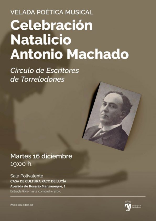 El Circulo de Escritores de Torrelodones quiere rendir un homenaje a nuestro gran poeta y dramaturgo Antonio Machado con motivo de su 150 natalicio. Este reconocido poeta pertenece a la Generación del 98 y su obra reluce como una de las cumbres de la literatura española. En sus poemas sobresalen los sentimientos de angustia, soledad, tristeza reflejando una honda inquietud existencial. Con su obra nos dejó una poesía reflexiva y de estilo claro y natural. En la velada, escritores de Torrelodones declamaran poemas del insigne autor y también un cantautor nos deleitará con algunos de sus poemas más conocidos.